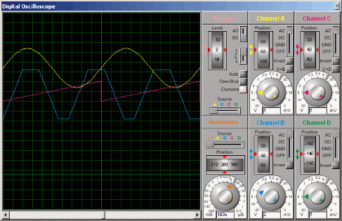 The VSM oscilloscope models a four beam analogue oscilloscope.